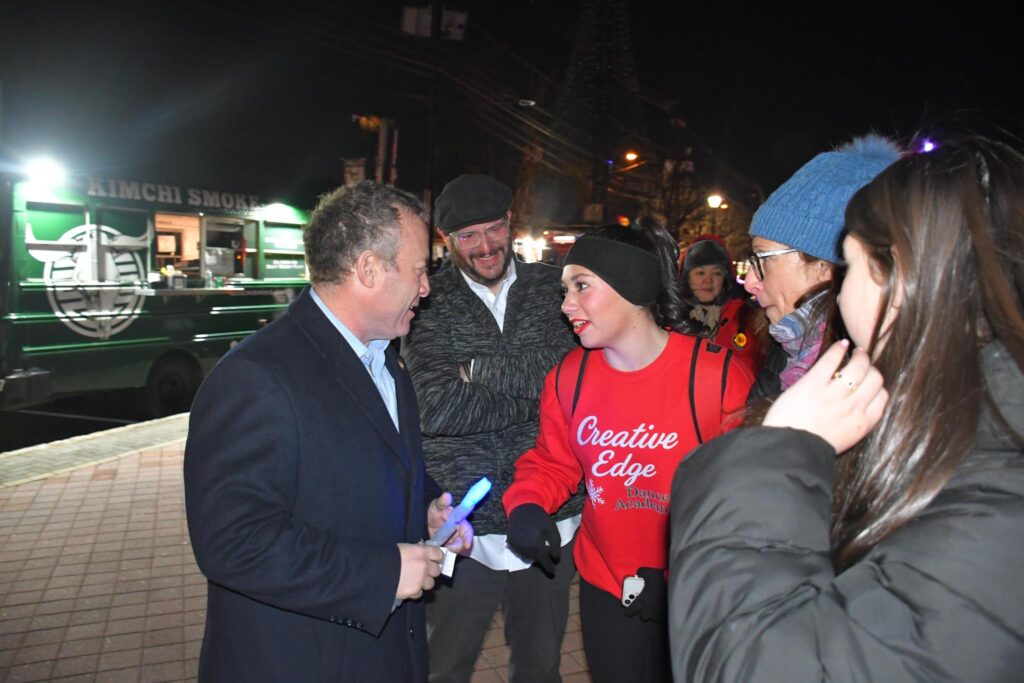 Above: Gottheimer greets families at the Fort Lee tree lighting celebration.