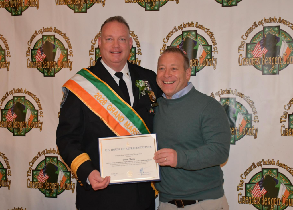 The event recognized 2026 Grand Marshal Brian Clancy, as well as this year’s Aides to the Grand Marshal and Gunning Award recipients, honoring individuals for their leadership, service, and commitment to preserving Irish culture in Bergen County.